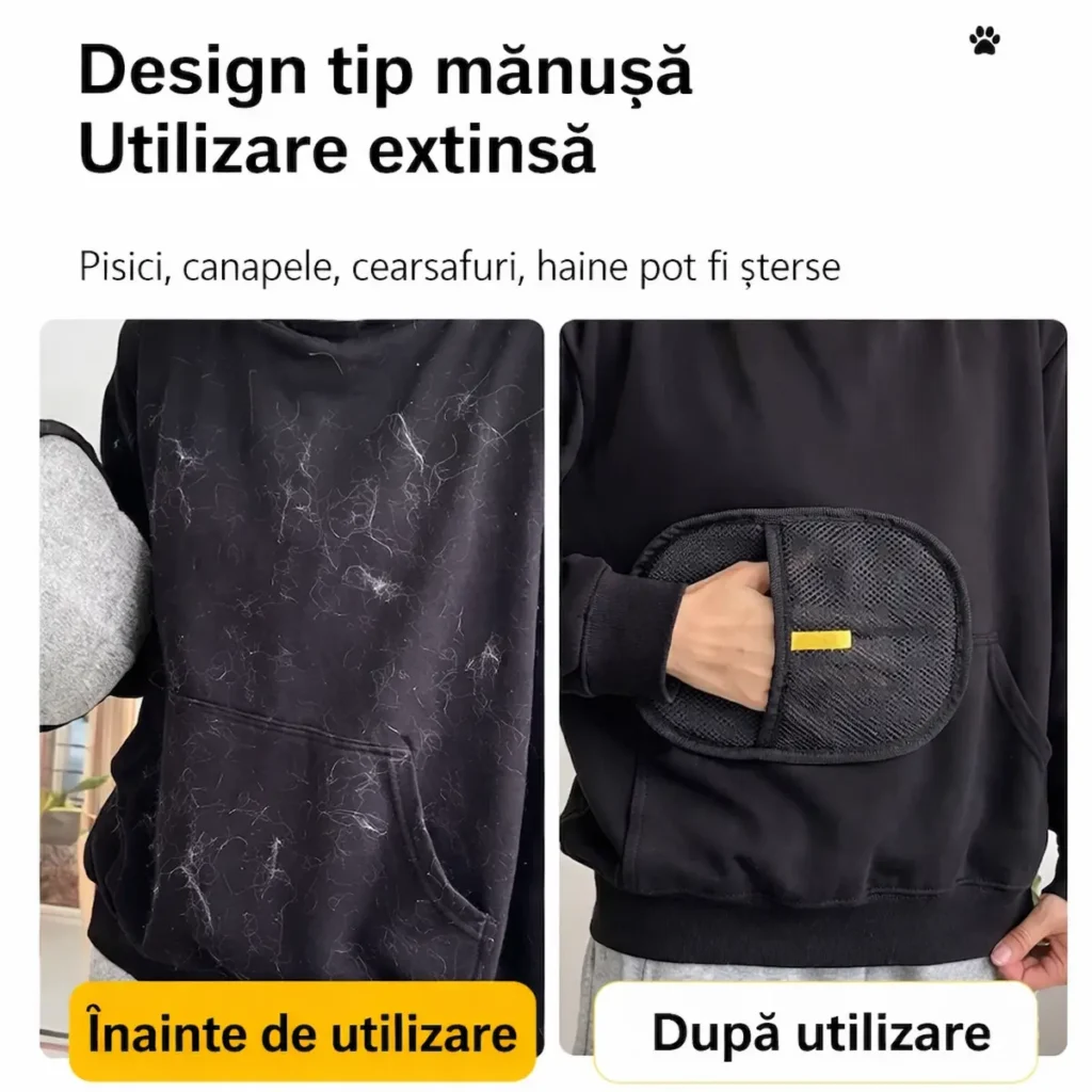 „Am 2 câini. Canapeaua era mereu plină de păr.Cu mănușa asta rezolv în 2 minute.” – Andreea M.